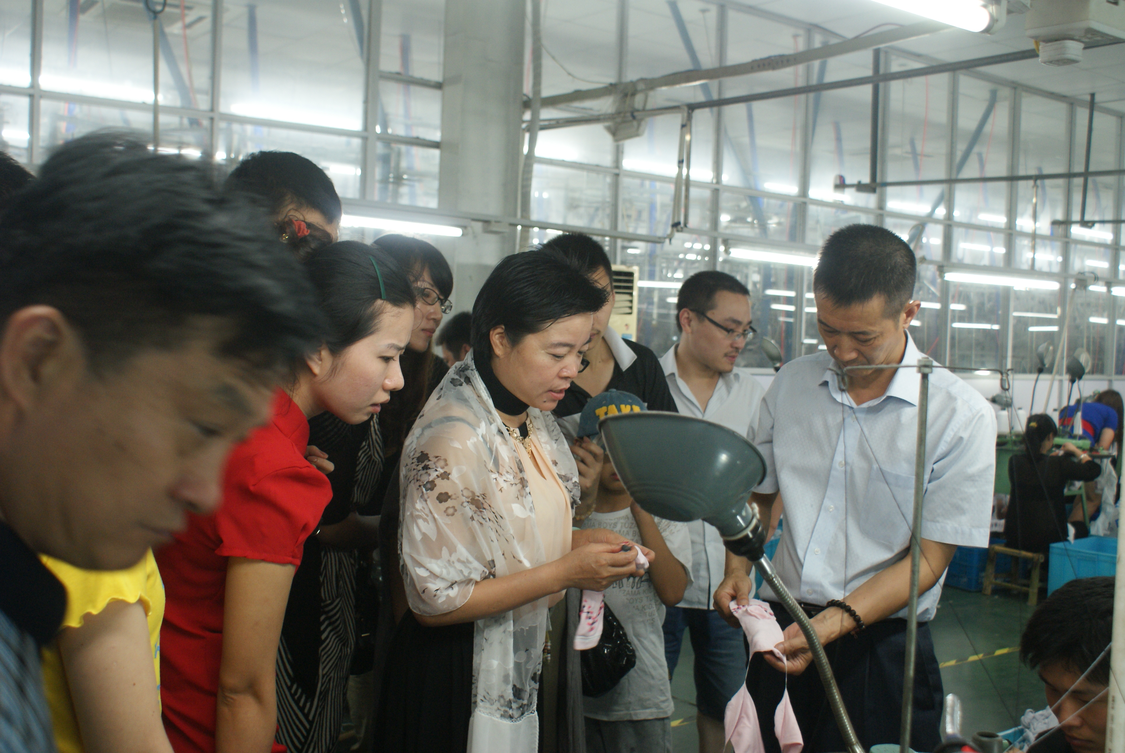 与会人员首先参观了浪莎三期工业园,了解了浪莎集团的发展状况、企业文化,与袜子、内衣生产的每一道环节来了一次亲密接触。参观过程中,人大校友、巨龙箱包董事长邵宝玲与工作人员细心交流。
