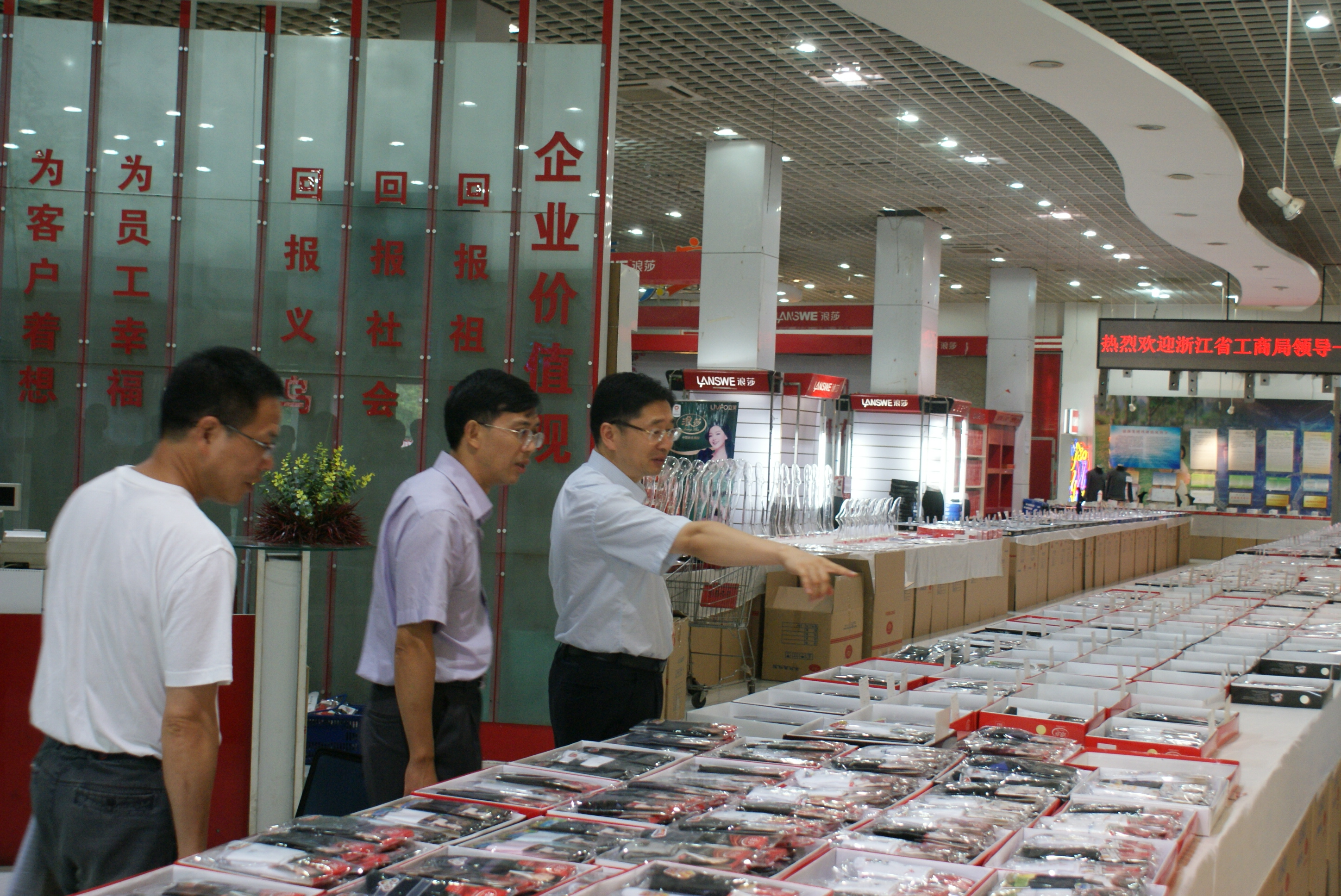 2012年9月13日,省工商局领导一行在义乌市袜业行业协会秘书长金善富的陪同下来浪莎参观考察。董事长翁荣金亲自接待,并进行了密切交流。
