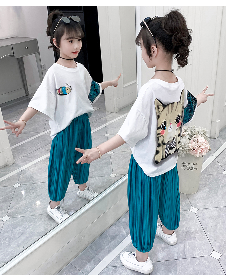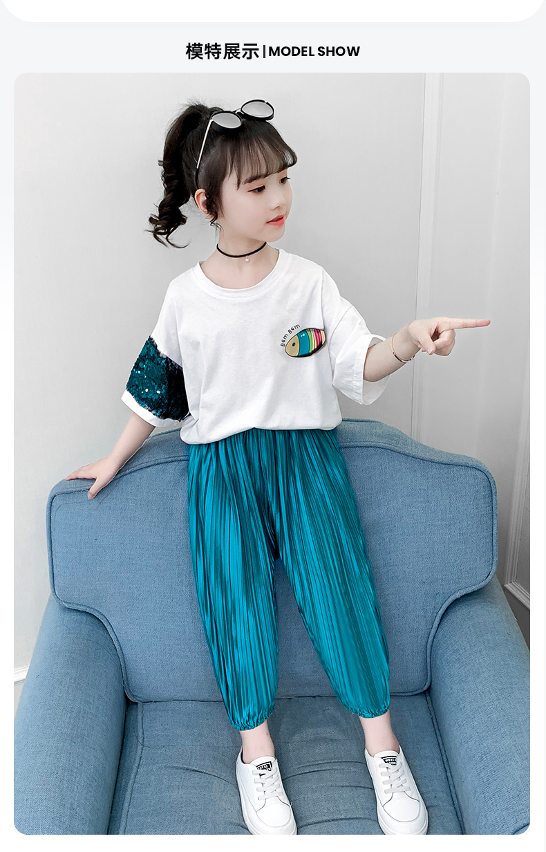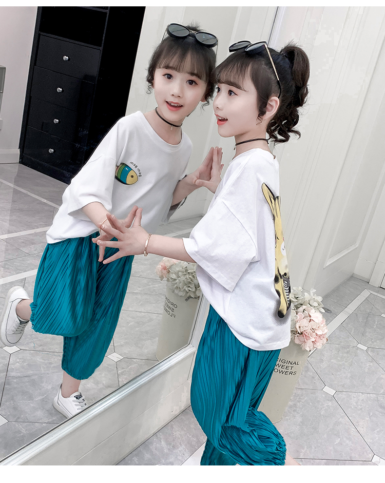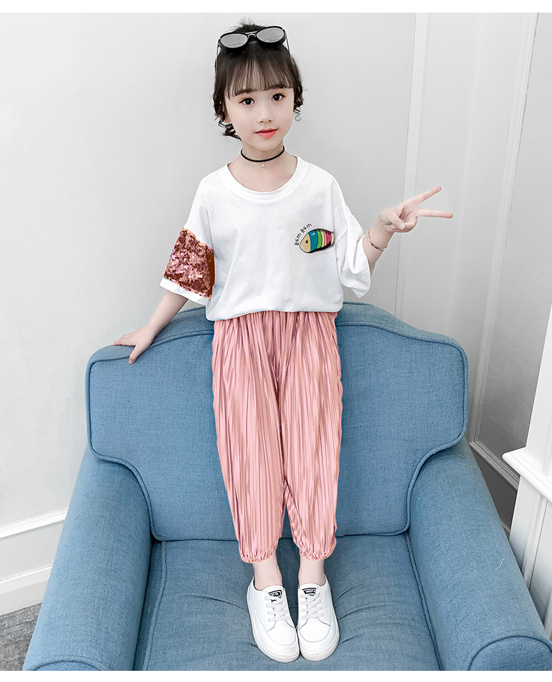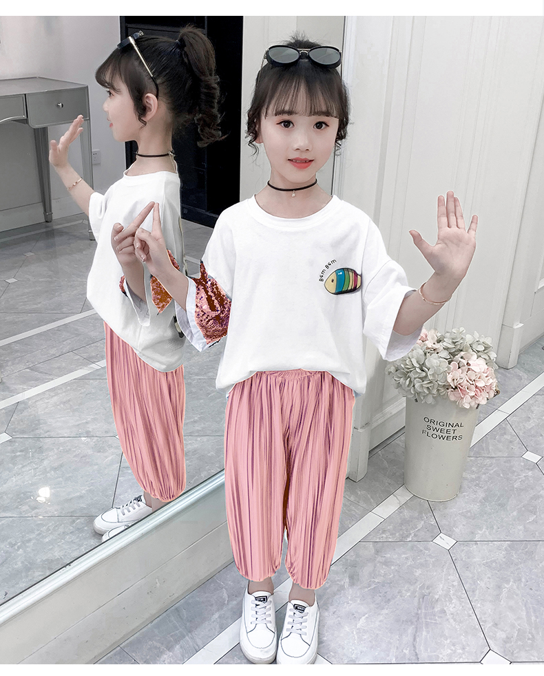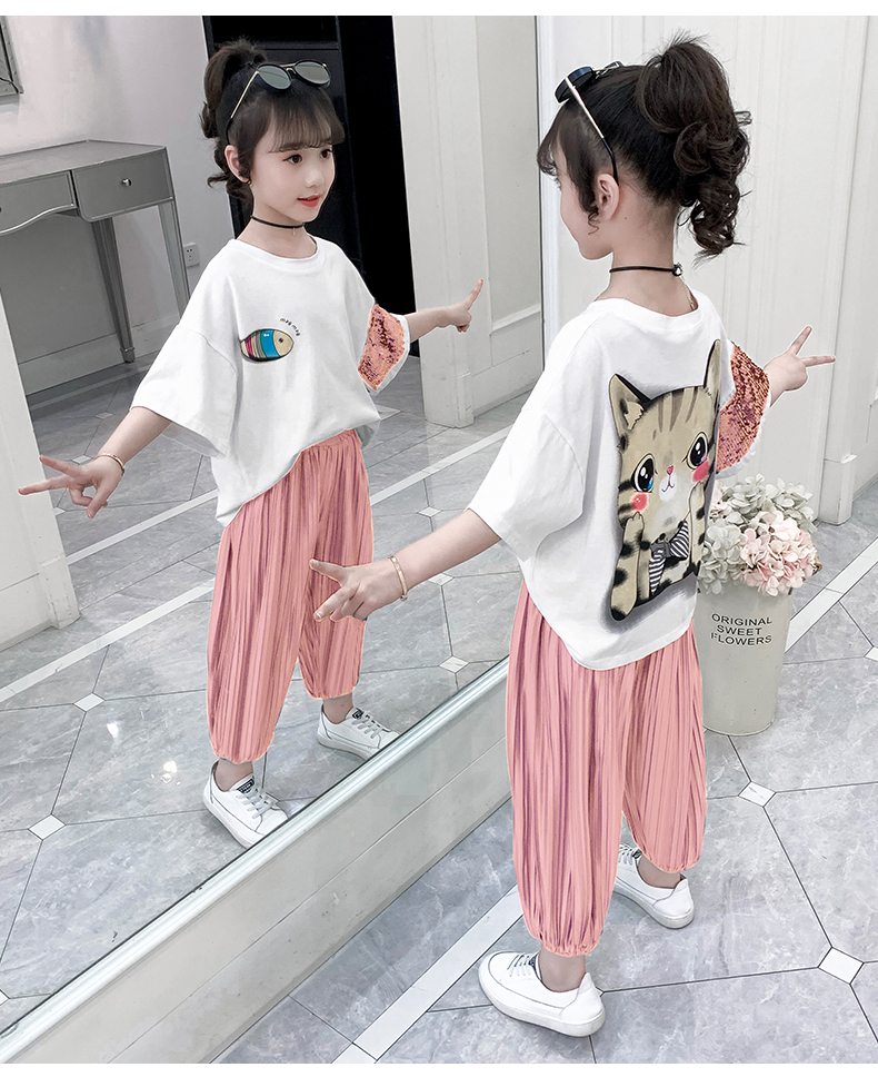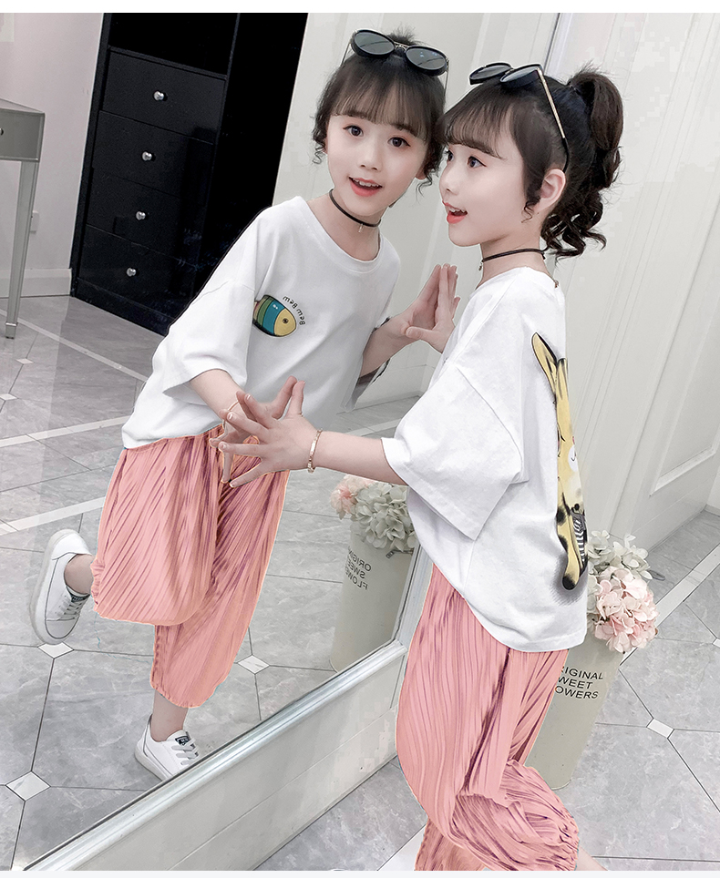 浪莎童装女童夏装中大童洋气t恤纯棉短袖套装儿童宽松冰丝防蚊裤